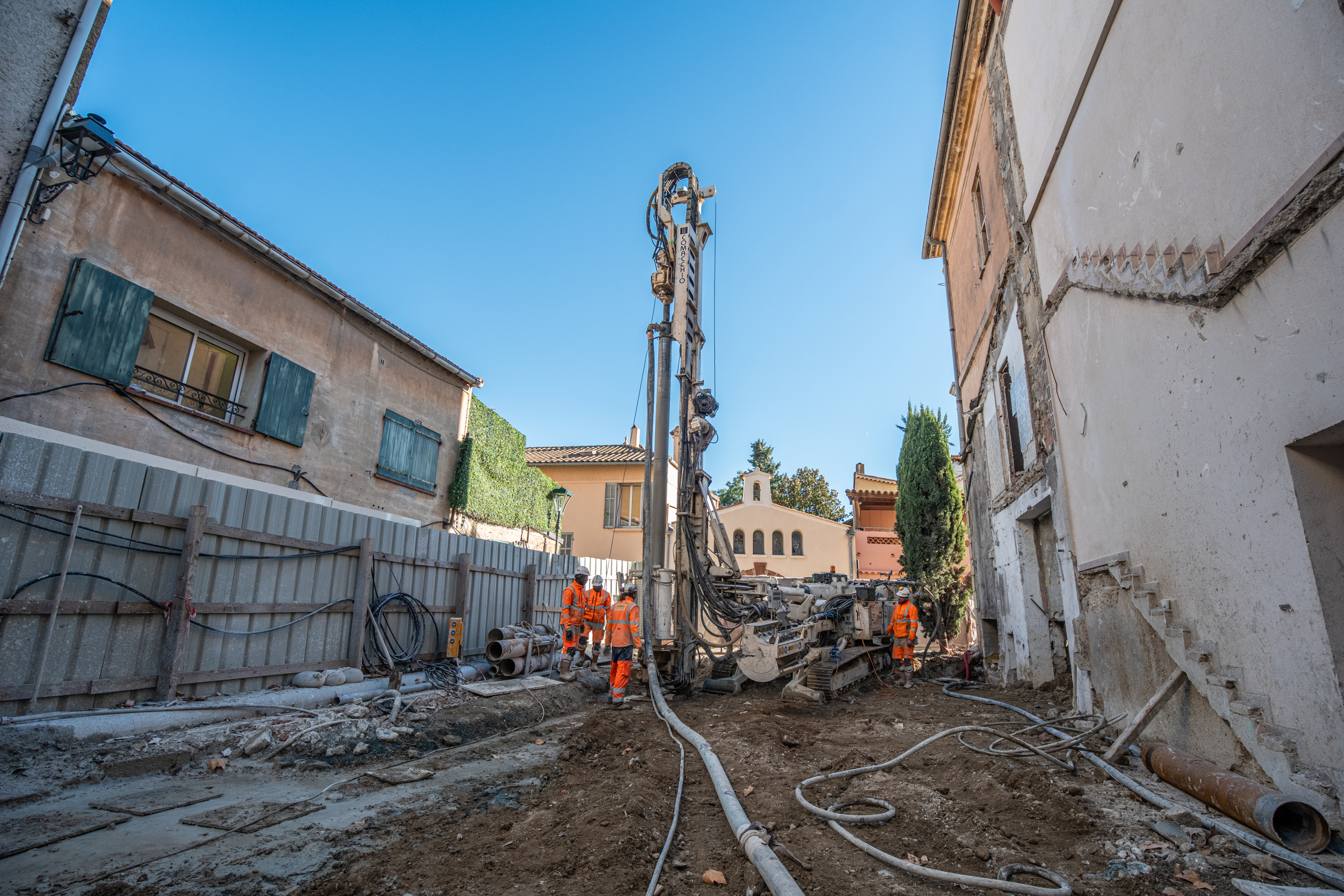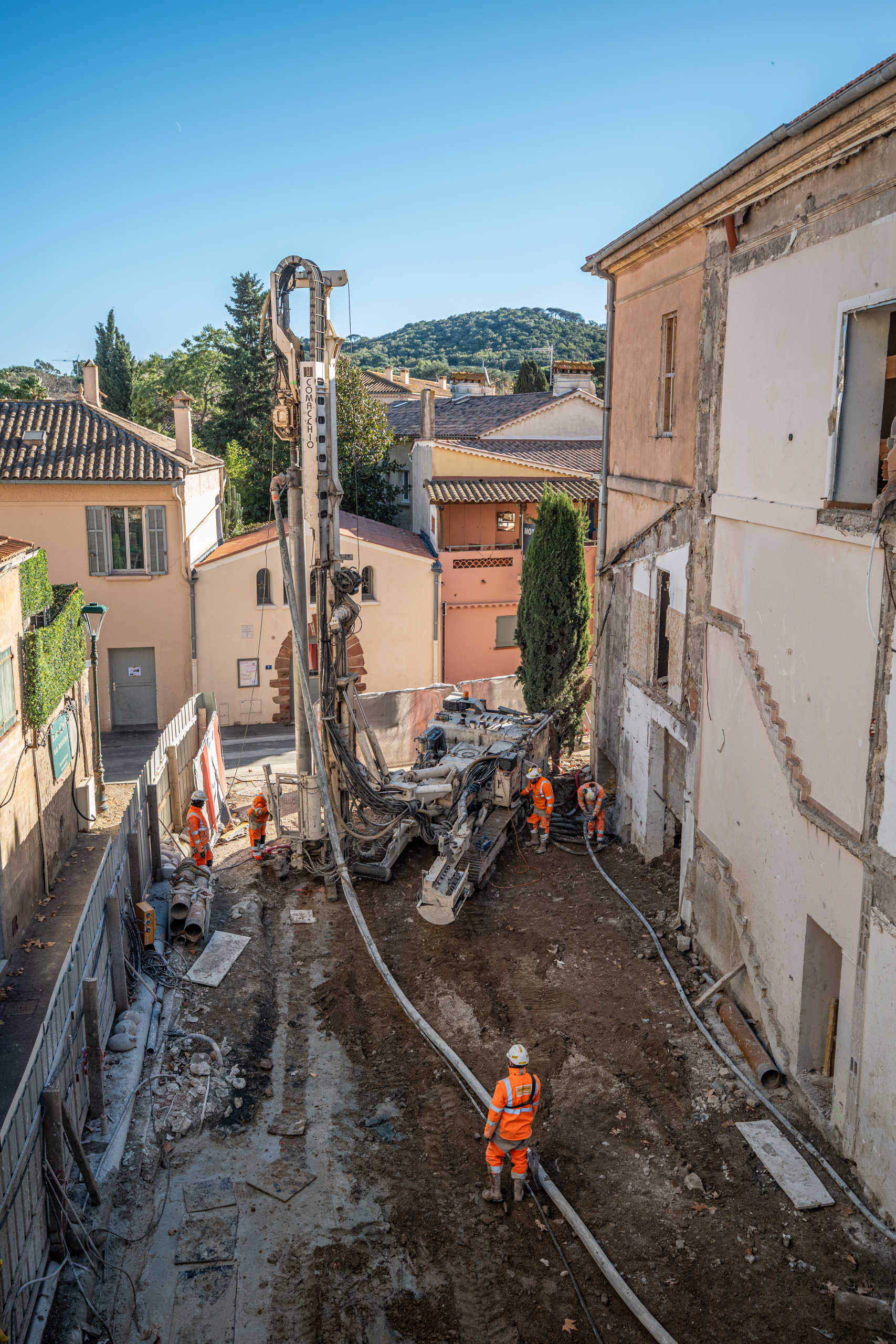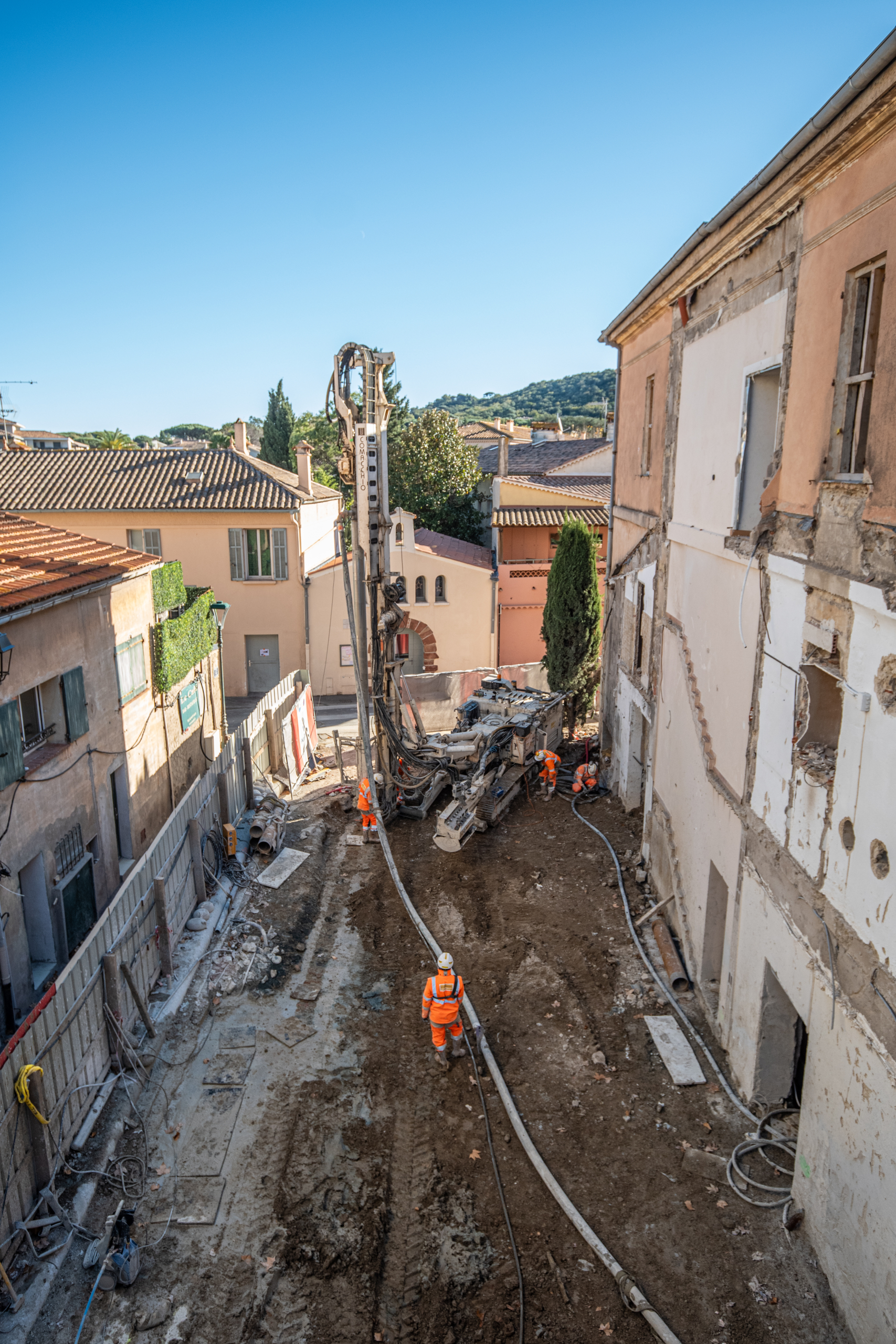 Ce chantier singulier de pose de micropieux sécants, marqué par de nombreux enjeux, a débuté fin octobre. Les travaux de Spie batignolles fondations se termineront fin février 2026, après près de 1 600 mètres linéaires de forage réalisé et à l’issue de la pose des butons. Il souligne l’expertise technique de Spie batignolles fondations pour la proposition de process adaptés aux contraintes de site, à l’agilité de ses équipes pour ajuster les méthodes employées au regard de différents aléas, afin de transformer un bâtiment emblématique du paysage tropézien.