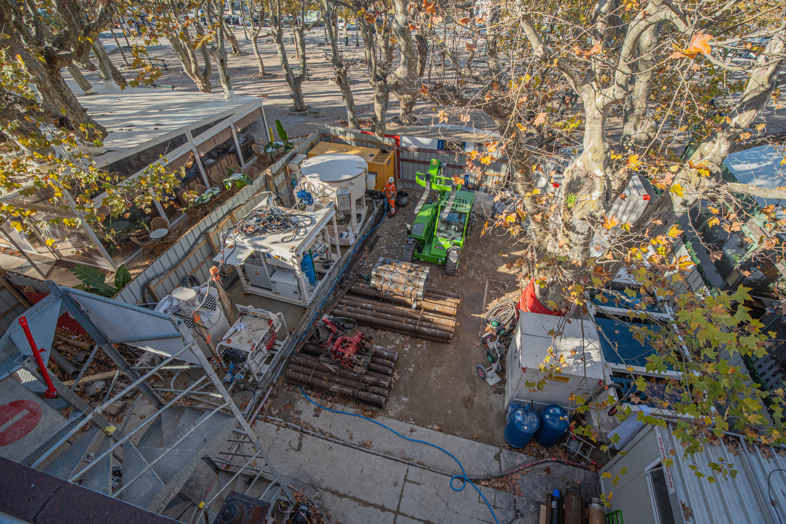 La centrale de coulis a été positionnée devant l’entrée du bâtiment, ainsi qu’un bac à eau et de décantation des huiles dans un espace très limité. Les forages sont réalisés sur l’ancienne partie du bâtiment démolie.